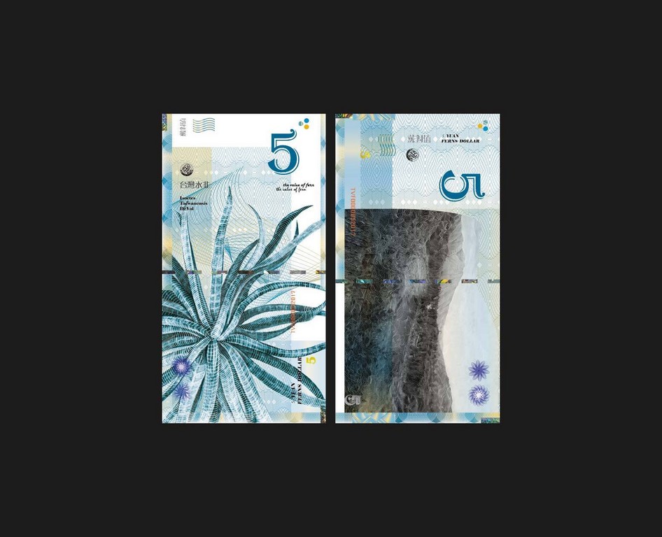 10款紀念鈔票,是依據台灣10種幣值設定,尺寸參考國外的紙鈔尺寸;鈔票色系的設定,則是根據蕨類生長環境區分為「藍色系—湖泊河流」、「綠色系—熱帶雨林」、「橘色系—土壤山區」。