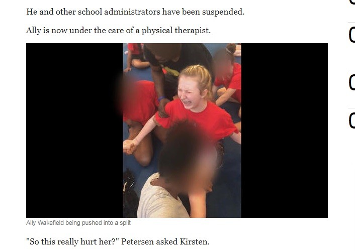 美國丹佛一名13歲的啦啦隊員,在訓練時被教練、隊員集體壓制,不管她連連哭喊、尖叫,被迫一字馬劈腿,導致腿部受傷。影片曝光後,警方緊急介入調查,目前啦啦隊的教練、校長等行政人員,皆已被勒令休假。