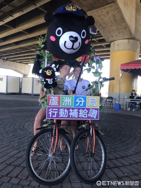 考量微風運河戶外場館寬廣,蘆洲分局除了定點式的補給站外,更租用電動腳踏車,並裝飾吉祥物,打造「行動熊讚補給車」,每小時繞場一次,將滿滿的物資及冰涼飲品主動送至各維安崗哨上,讓員警不必擔心因短暫離開崗位而產生維安漏洞,亮眼的外型也吸引外國選手的目光,紛紛搶搭並拿自拍棒自拍。