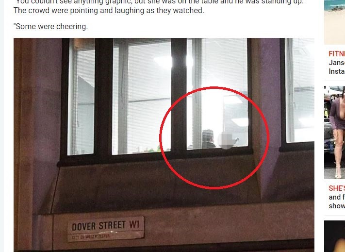 從照片中可見,位於一樓的咖啡廳已經打烊,也非正常上班時間,但事發地點的辦公室疑似有人正在「加班」。據《The Sun》報導,眼尖的民眾發現樓上辦公室相當明亮,仔細一看,一對男女正興奮地上演活春宮,有目擊者說,女生在桌子上,男生則是站起來,大家都邊看邊笑,還有人興奮歡呼。