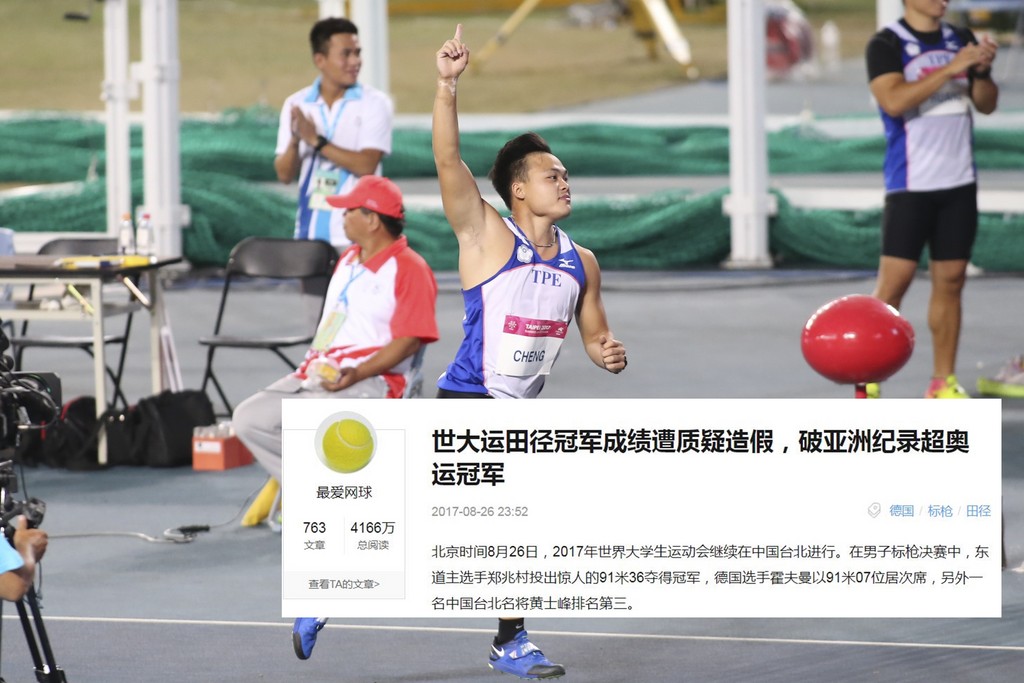 台灣標槍好手鄭兆村26日在標槍決賽中,擲出了91公尺36的驚人成績奪下金牌,不但突破了個人紀錄、大會紀錄,還成為首位標槍擲破90公尺的亞洲運動員,更登上國際田徑總會(IAAF)官網。但是卻有大陸媒體質疑,鄭兆村破紀錄手法不純,並以「田徑冠軍成績造假」為標題,該篇文章因此引起網友紛紛撻伐。