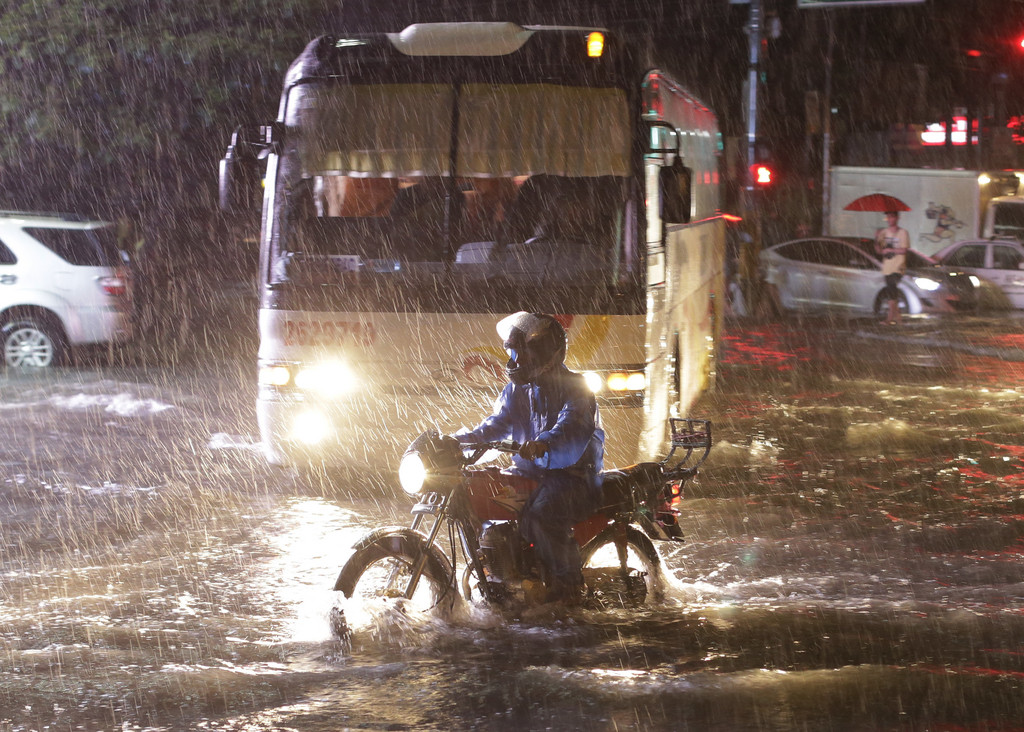 ▲一名男子在菲律賓首都馬尼拉冒著大雨騎車。(圖/達志影像/美聯社)