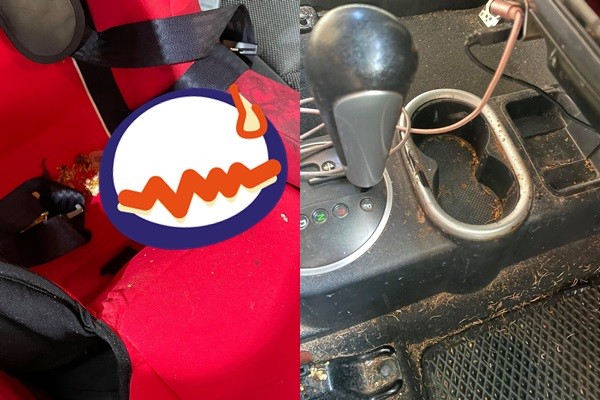 從畫面中可見,地墊上充滿垃圾、碎屑,車內也多處生鏽,兒童座椅不僅嚴重破損,上面更有疑似廚餘的不明物,讓人不敢恭維。