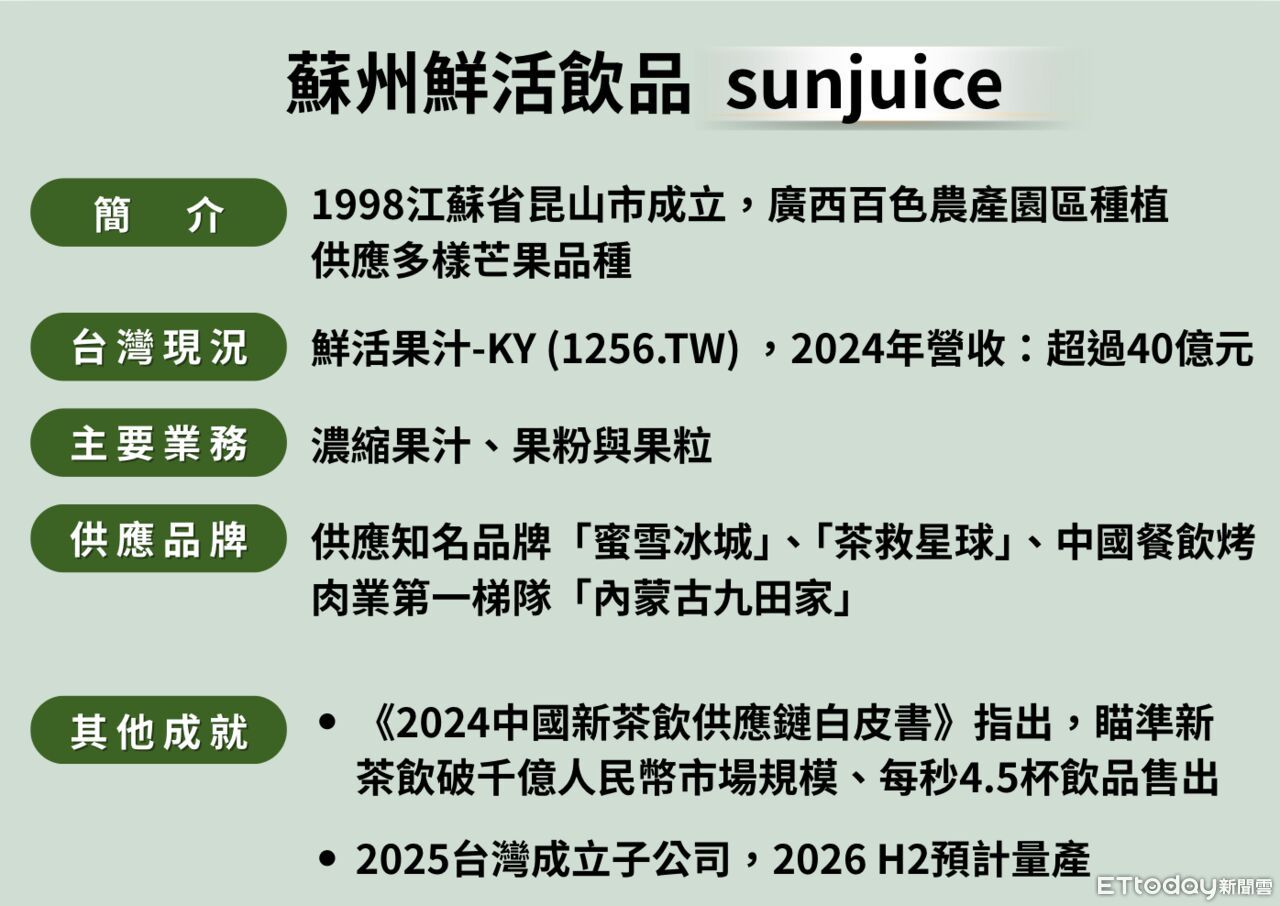 危機之後,蘇州鮮活飲品逐步壯大,從一家小型供應商成長為中國最大的果汁原料商。隨著新茶飲市場突破千億元人民幣規模、消費速度驚人(平均每秒售出 4.5 杯飲品),公司順利打入「蜜雪冰城」、「茶救星球」等知名品牌的供應鏈,更進一步服務餐飲烤肉業龍頭「內蒙古九田家」。歷經30多年的深耕,蘇州鮮活飲品從一家小型供應商,發展為中國大陸最大果汁原料商,打入「蜜雪冰城」、「茶救星球」等知名品牌供應鏈,甚至服務餐飲烤肉龍頭「內蒙古九田家」。2012年9月5日回台上櫃,2024年營收超過40億元,曾長期穩坐食品類股股后。