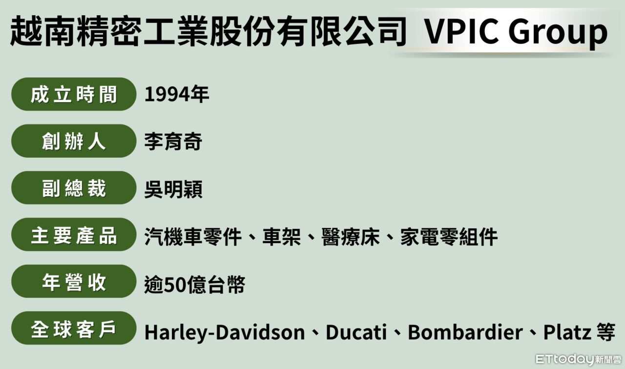 越南精密工業股份有限公司(VPIC)是台商靈活應變的典型案例。自1994年創立至今,已在越南深耕30年。旗下產品涵蓋汽機車零件、醫療設備、家電零組件等,客戶名單囊括哈雷(Harley-Davidson)、杜卡迪(Ducati)、龐巴迪(Bombardier)等世界級品牌,外界稱之為機動車界的「小鴻海」。其中,子公司勝邦金屬更被副總裁吳明穎形容是集團的「台積電」,以先進製程扮演獲利小金雞的角色。
