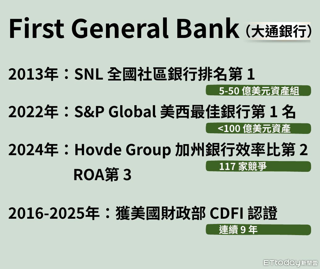 2024 年最新出爐的加州銀行評比,First General Bank(大通銀行)在117家競爭對手中,拿下效率比第2名、平均資產回報率第3名的亮眼成績。這家總資產僅 11.37 億美元的「小銀行」,憑什麼能在金融巨獸林立的加州殺出血路?