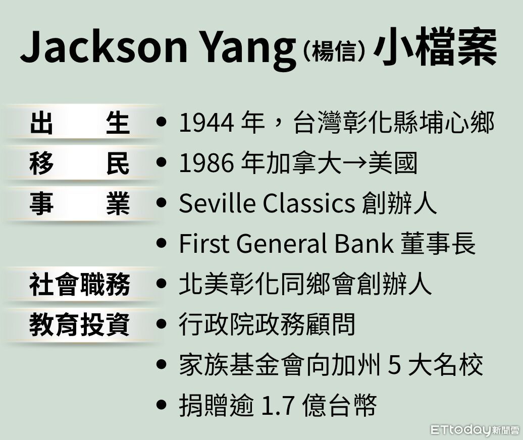 2008 年,Jackson Yang 創立北美彰化同鄉會;2012 年設立「楊信獎學金」,最初只幫助彰化師範大學畢業生赴美深造,但他很快發現,「只幫彰師大學生,影響有限。」後來,在前駐美代表袁健生牽線下,與教育部合作,擴大到 5 所名校。他對每所學校捐款都超過 100 萬美元,其中 UCSD 因當時中研院院士錢煦大力推動,更加碼到 150 萬美元。