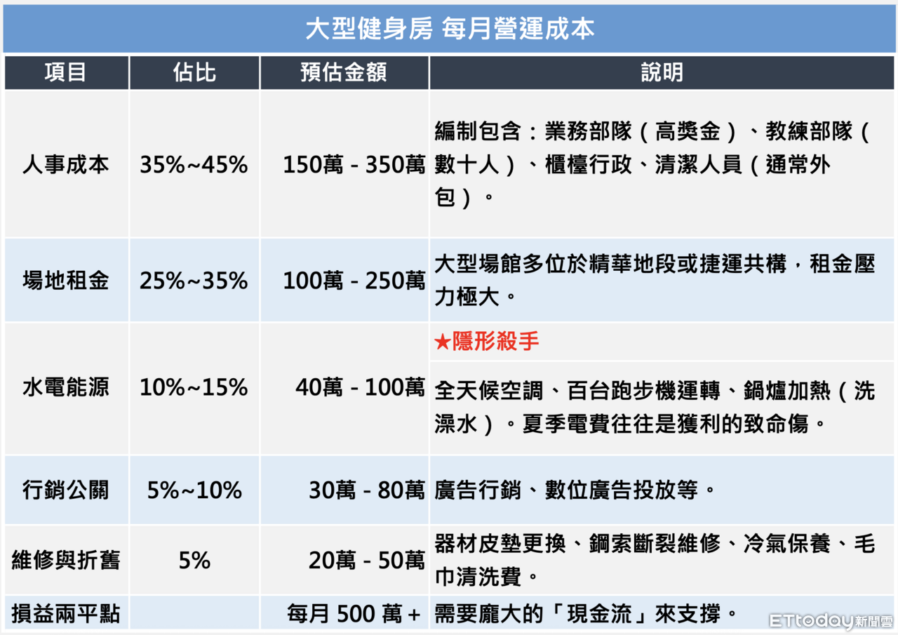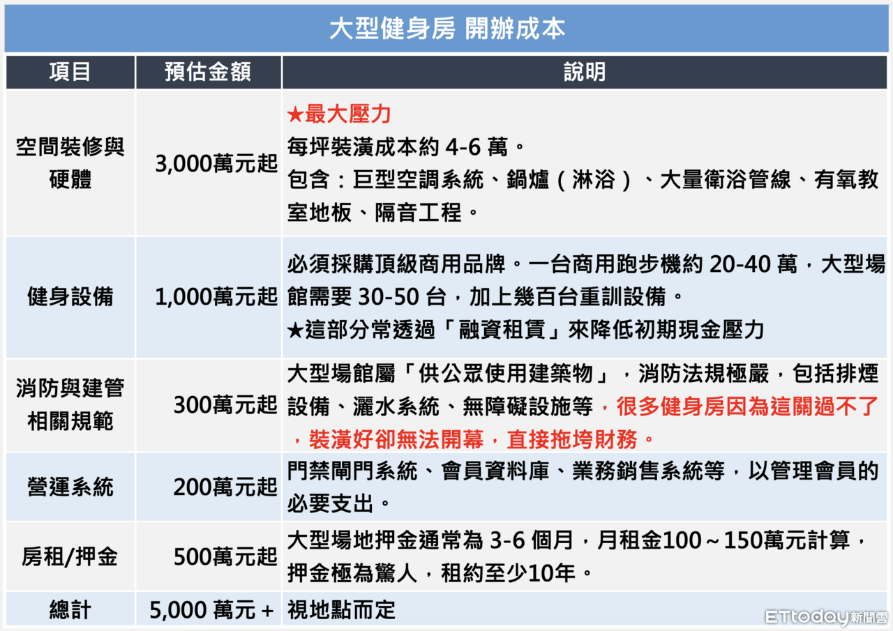 當大家問:「這些倒閉事件為何總是上演?」必須看清大型健身房的商業邏輯。前大型健身房財務主管 X 先生說明,開設一家 500〜800 坪的健身房,本質上是一場「重資產、高槓桿、靠現金流撐」的資本運作,從房租、押金、裝潢、中央空調、消防安檢與管線佈建,到大量器材採購、淋浴與更衣室、宣傳成本,開幕前就要投入 5,000 萬到 8,000 萬的資金,而且這些成本有超過 7 成必須在開門前就付清。