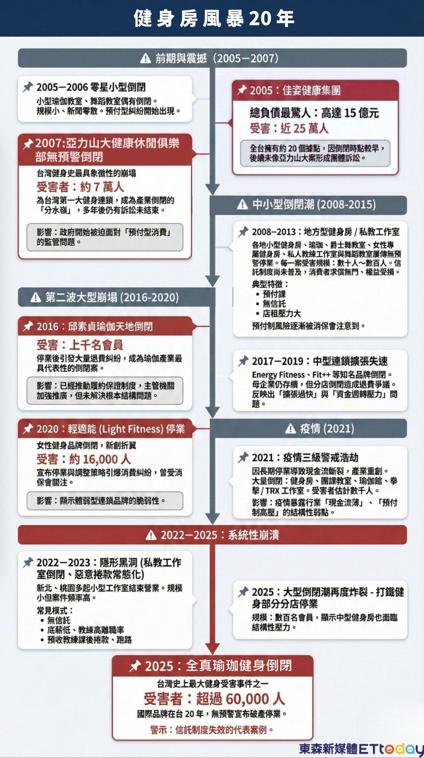 全真案受害者 Amy、Alice 並不是個案,許多會員在倒閉前幾天才剛刷卡繳費,卻在一夕之間發現會籍全數作廢、預付款蒸發。這不是偶發事件,而是台灣健身產業 20 年來反覆上演的劇本:亞力山大、邱素貞瑜珈天地、輕適能……倒閉的時間點幾乎都落在「預售最旺」的時刻。消費者以為撿到便宜,殊不知那可能是資金鍊即將斷裂前的最後吸金。
