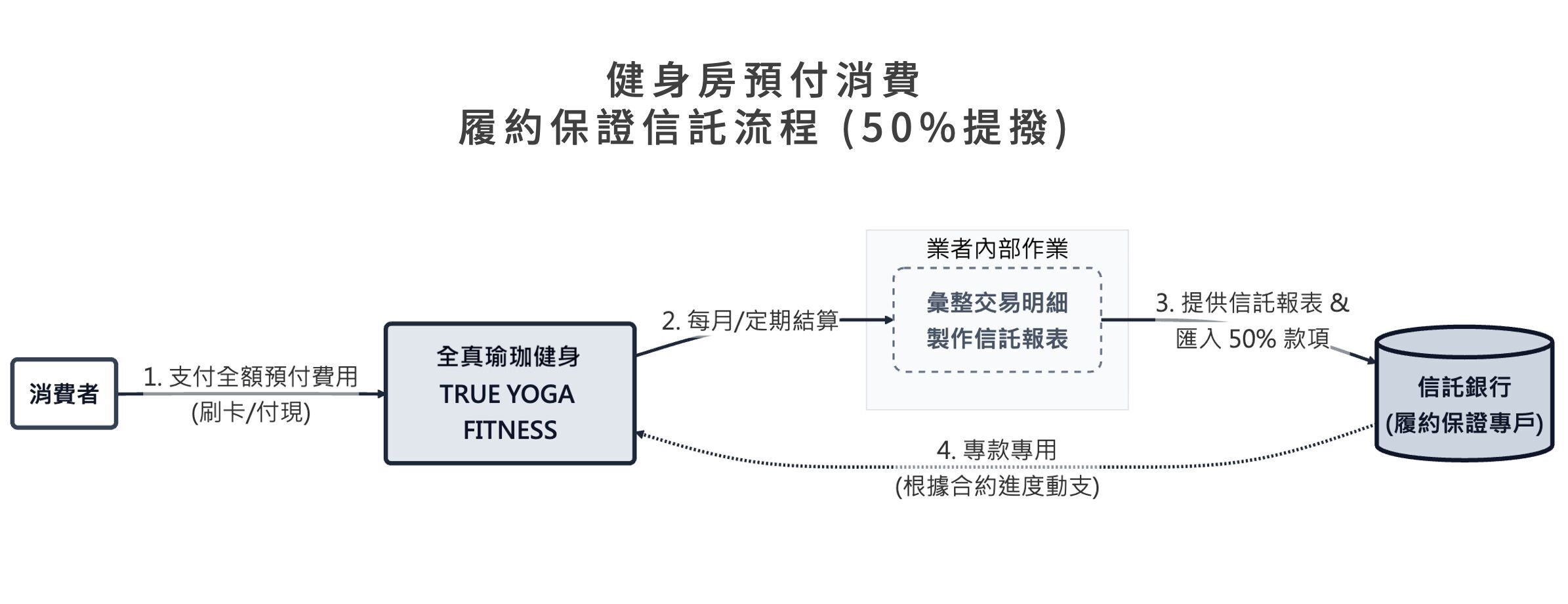 然而,制度在實務運作上仍存在明顯落差。李協理直言,銀行根本無法掌握業者實際收到多少款項,「我們看到的都是全真每月整理後給的資料。」他說,這種模式與其它採用 100% 履約保證金信託的產業截然不同,例如:餐飲禮券、藝文票券或百貨商品券,尤其在信用卡消費中,銀行能從專戶即時掌握每筆交易,不需依賴業者申報。相較之下,健身業僅要求提撥 50%,刷卡款無法直接進入專戶,只能把實際金流跟報表分開作業,導致銀行只能被動等待報表,無法從消費端直接比對入帳狀況。