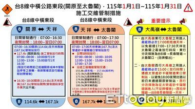 4月3日強震重創花蓮,交通部提出改善列管計畫,震後台9線受損邊坡預計今年度改善完成,台8線中橫公路受損邊坡預計今年底辦理改善,台8線4處位太魯閣明隧道包括九曲洞隧道西口、九曲洞隧道東口、錐麓隧道、靳珩隧道等改建延長,將在115年底完成。詳全文>>