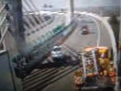 日前網路流傳的一段畫面中,一顆重達150公斤重的大輪胎突然從台61線橋上飛落,在大馬路上彈了好幾下,最後滾進某間倉庫,撞倒機車才停下,所幸未波及任何人車。警方表示,該輪胎是從某貨運車掉落,將傳喚王姓駕駛到案並開罰。 詳全文>>