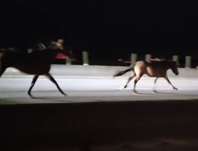 苗栗縣後龍鎮西濱快速道路13日晚間6點左右驚見2匹馬匹闖入車道,警方先後接獲民眾通報,指稱道路上有馬匹行走影響行車安全,隨後即傳出車輛與馬匹碰撞事故。外埔派出所員警獲報後立即趕赴現場,實施交通管制並進行疏導,防止二次事故發生。詳全文>>