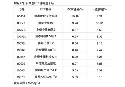 陸股10月27日強勢上攻,AI概念股全面點火,激勵相關ETF同步飆升。復華中國5G(00877)受惠成分股勁揚,單日飆漲近10%,位居陸股ETF漲幅第一、全體股票型ETF第二名,漲勢甚至超越多檔槓桿型ETF,展現驚人爆發力。詳全文>>