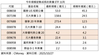 受到高利率環境與台幣升值夾擊,美債ETF今年資金明顯流出。不過,仍有8檔規模持續成長,多數為中短天期產品,僅有3檔長天期美債ETF吸引資金回流,以復華20年美債(00768B)新增規模居冠,大華優利美公債20(00983B)與元大優息美債(00967B)分居第二、第三名,顯示長天期債仍具吸引力。詳全文>>