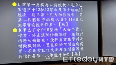 空軍花蓮基地飛官辛柏毅上尉昨駕駛F-16V戰機(機號6700)執行夜間訓練時,傳疑因模組化任務電腦(MMC)訊號故障,導致辛柏毅產生「空間迷向」錯覺,緊急跳傘逃生,行蹤不明。對此,空軍司令部督察長江義誠少將今(7日)表示,迄今已派遣空中13批13架次及海上艦艇11艘次,正集中兵力加強搜索,而第二作戰區亦派遣計119員至海岸實施搜索,此外空軍也已下令F-16機停止演訓任務。在記者會結束前,江義誠哽咽希望國人替辛柏毅祈福。詳全文>>