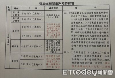 國民黨、民眾黨立院黨團提出賴清德總統彈劾案,關於彈劾案時程,國民黨團書記長羅智強今(26日)指出,明年1月中將進行2場公聽會,接著也召開第一次全院委員會,並2度邀請被彈劾人、賴清德被詢問,最終彈劾案的投票日將定在5月19日。詳全文>>