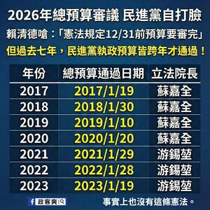 中央政府總預算至今仍卡在立法院無法審議。總統賴清德25日重砲怒轟藍白,「憲法明文規定立法院對明年度預算要在今年12月31日前審完,如果立法院沒有辦法如期審查總預算,不要跟人家談憲政」。對此,粉專政客今(26日)貼出往例打臉,政客爽指出,從2017到2023年,民進黨完全執政,立法院長也是民進黨的,結果總預算的日期通通超過12/31,按照賴清德講法,民進黨每年都在違憲,對了,沒有這一條憲法,是賴清德自己瞎掰的。詳全文>>