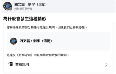 網紅四叉貓(劉宇)常在網路上談論時事,吸引許多粉絲關注,不過,他今天發文透露,自己的其中一個粉專被檢舉「涉嫌詐騙」,目前已經被永久停權了。消息一出,不少網友都留言表示,「過分」、「而且故意挑兩個帳號裡曝光最高的」。詳全文>>