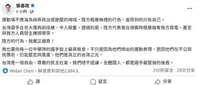 2025世界大學運動會在德國舉行,桃園市長張善政針對我國代表隊跆拳道男團23日拿下銀牌,代表團頒發教育部長賀電時,卻有2名中國大學生體育協會人員上前、試圖搶奪賀電,甚至與我方人員、媒體記者發生推擠衝突情事,今在臉書PO文「運動場不應淪為操弄政治或施壓場域,陸方粗暴無禮行為,羞辱到的只有自己。」詳全文>>