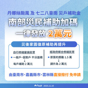 為協助丹娜絲颱風及728豪雨災民加速重整家園,內政部今(10日)表示,行政院已於11月6日核定修正丹娜絲風災家園復原補助金專案,凡是未參加政府媒合修繕平台、自行修繕屋損的災區民眾,包括一般戶及弱勢戶,不分面積一律都發2萬元補助,另在今年9月3日至10月6日期間,由政府媒合簽約修繕的民眾,原1.5萬元的簽約獎勵金也一併同步調整至2萬元。詳全文>>