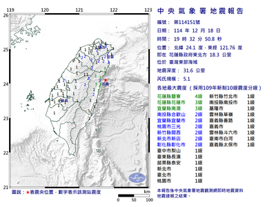 花蓮縣東部海域18日晚間7點32分發生規模5.1地震,深度31.6公里,屬於淺層地震,最大震度4級。中央氣象署18日晚間表示,未來三天不排除還會有規模4.5至5的餘震發生,呼籲民眾保持警戒。詳全文>>