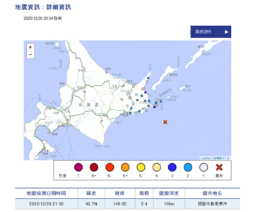 日本青森縣東方外海8日深夜發生規模7.6強震後餘震不斷。根據日本氣象廳測報資料,青森東方外海10日深夜10點56分發生規模5.9點地震,最大震度4級,也是自7.6強震發生後,當地發生的第23場地震。詳全文>>
