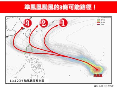 氣象專家林得恩分析,準鳳凰颱風的4條可能路徑!其中1條綜合特殊路徑是颱風中心將於台灣南部登陸、東部出海,這也是目前對台灣殺傷力較大的路徑之一。詳全文>>