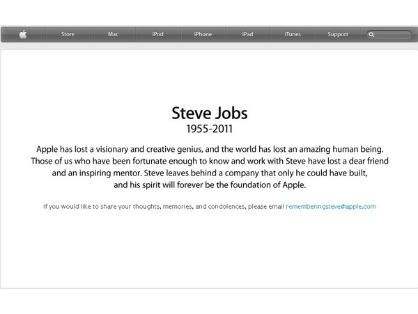 蘋果官網首頁也換成賈伯斯的照片,官網發布公告,「蘋果失去一位有遠見和創造力的天才,世界少了一位驚世奇才。我們有幸和史蒂夫共事,失去了這位親愛的朋友和啟發者。史蒂夫留下一個只有他能創造的公司,他的精神永遠是蘋果的基石。」