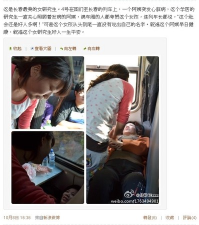 一則《這是長春最美女研究生》文章近日在網路上不斷發酵流傳。原來是在本月4日,在從圖門到長春的列車上,廣播突然傳出求助信息,一名乘客突然病發,就讀長春中醫藥大學研二學生立刻趕到那位婦人身邊,先是給病人一粒她隨身攜帶的速效救心丸,並守在她身邊仔細照料,直到對方好轉才離開。