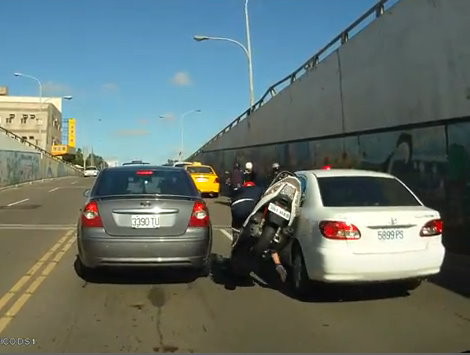 ▲機車騎士鑽車縫不成,撞上兩旁的轎車。(圖/翻攝YouTube)