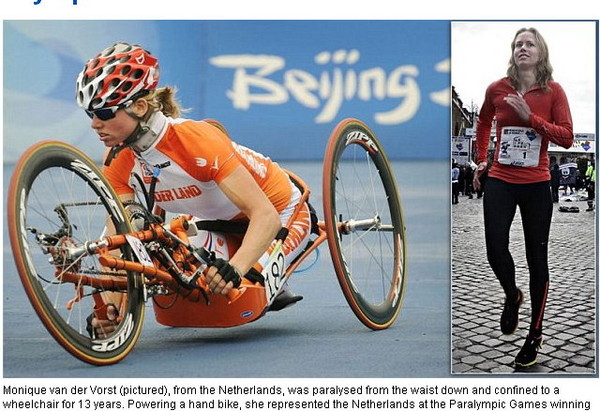現年27歲的莫妮卡.范.德.沃斯特(Monique van der Vorst),本是荷蘭的身障運動選手。但去年春訓時發生的一次自行車意外。這趟奇蹟的意外讓她的腿抽搐發抖,但又好像打通了她的任督二脈, 她的雙腿竟然可以恢復走路!如今,她已積極準代表祖國參加2016年奧運。