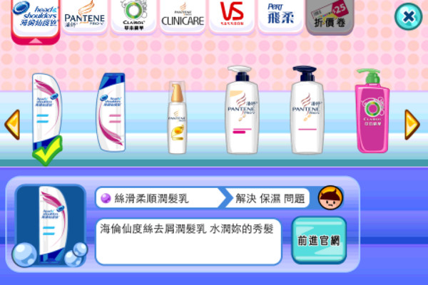 ▲ 《美髮玩家》將合作廠商P&G寶僑家品旗下的「海倫仙度絲」、「Clinicare」、「潘婷」等各項知名產品置入於遊戲中,玩家可以透過說明選擇適合的產品解決遊戲中的問題,也可以曾進日常生活中的美髮常識。(圖/廠商提供)
