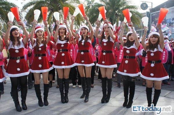 林益世的主播夫人彭愛佳穿著和先生一樣,也打扮成聖誕老婆婆,不過和辣妹相比下低調許多,主要靠她的親和力來取勝。現場民眾轉述,這些辣妹都有165公分以上的高挑身材,有職業也有業餘的show girl,每個辣妹傲人的三圍,配上甜美笑容和南台灣特有的熱情,相當「溝」魂,火辣程度不輸車展、電玩展。