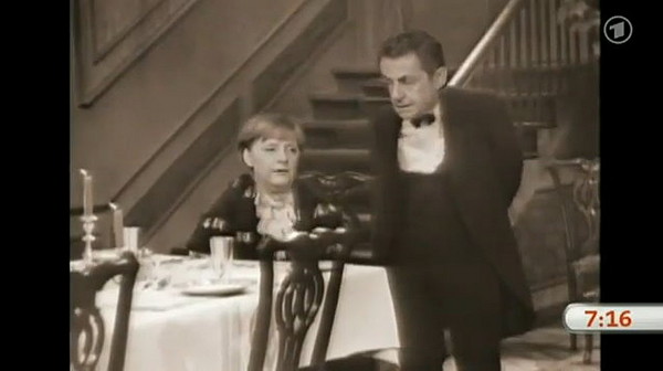 短片對白:「喔主人,除了我以外,其他人都沒來。」「那不是剛好嗎!所有決定也不會有人抗議啦!」薩科齊更是得陪梅克爾演起獨角戲:「巴本德里歐(前希臘總理),乾杯!」「乾杯!」「我的小老弟,薩巴德洛(西班牙前總理)。」「嗨嗨嗨,梅克爾女士,最特別的朋友卡麥隆(英國首相)。」「別忘了在這裡,我們全是說德語喔!」「妳看起來越來越年輕了(英語),而且比以前更有錢呢(德語)。」「我會把我的3A信評送給妳,梅克爾女士。」