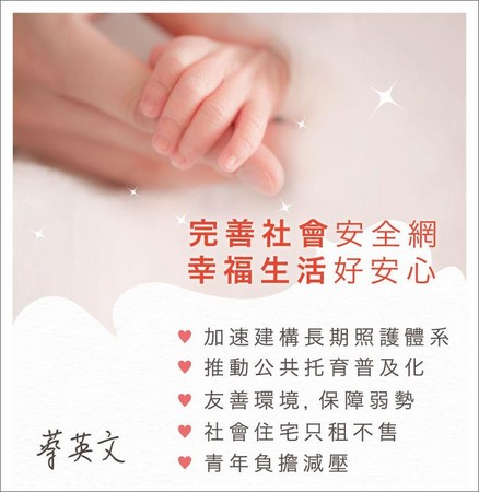 台灣的老人照護、兒童托育、弱勢友善環境等議題亟需各界努力及關心,民進黨主席暨總統候選人蔡英文提出「完善社會安心網 幸福生活好安心」政策,希望能為台灣為平凡而努力的人打造一個社會安全網,讓他們能夠安心生活,在不小心掉下來的時候,會有政府把他們接住。