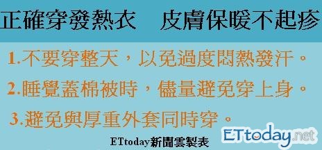 不要小看薄薄一件發熱衣,經過實際測試,貼身穿起來確實能提昇保暖度,只不過穿的時候,有些細節要注意。日前就有民眾興沖沖買了發熱衣,想說怕冷整天都穿著,沒想到隔天脖子以下皮膚竟然變得又紅又腫。