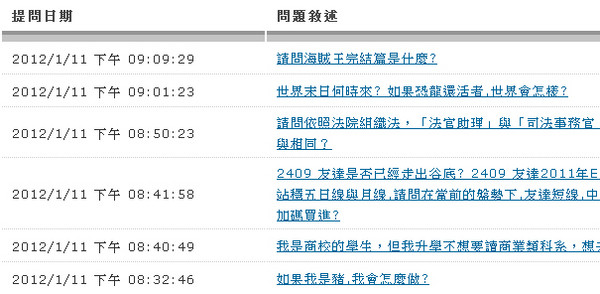 什麼都有、什麼都問,什麼都不奇怪!台北市立圖書館最近被瘋狂的網友攻佔,「線上參考服務系統」出現上千筆匪夷所思的提問:「世界末日何時來?」「請問海賊王的完結篇是什麼?」「請問白賊義的由來?」等等;由於每個提問館員都必須回應或刪除,讓圖書館員壓力很大。「惡作劇問題讓我們很困擾!」也呼籲網友,別再惡作劇下去了,還圖書館一個美好的空間。