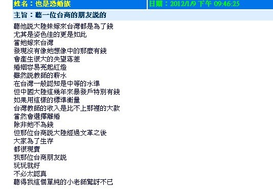 「高雄縣教師會留言版」最近留言變得很「八卦」,有人自爆貪圖美色,娶大陸女子,從結婚到離婚只有13天,劇情宛如「八點檔」;高縣教師會表示,留言版原本就是開放園地,凡是具名的留言都會給予尊重。