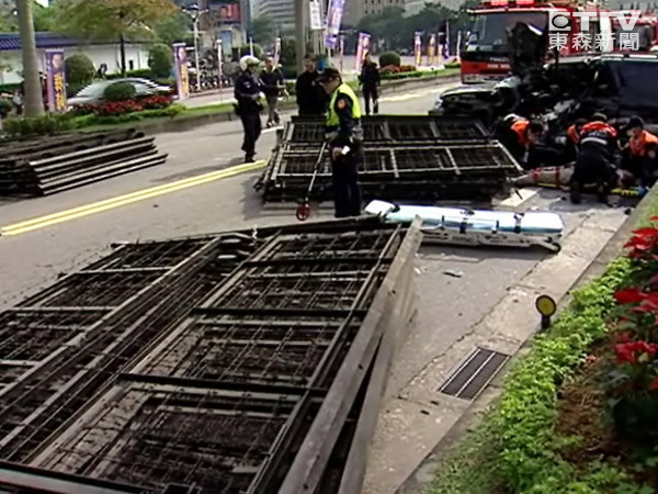 台北市警方14日一輛載送拒馬的貨車,行經台北市中山南路和愛國東路口時,車上兩塊拒馬突然掉落,正好砸中後面一輛小轎車,造成小轎車上3傷1無生命跡象。