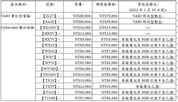 Sony這個調價活動僅到30日,預計調整價格的產品有VAIO筆電與Cyber-shot數位相機,調價幅度從1千元到1萬元不等,購買部分商品還加送周邊配件,像是購買Sony Tablet S系列平板,就加贈16GB的SD記憶卡、專屬保護套以及專用USB轉接線,總價值超過$3,000元,其他相關價格如下表所示: