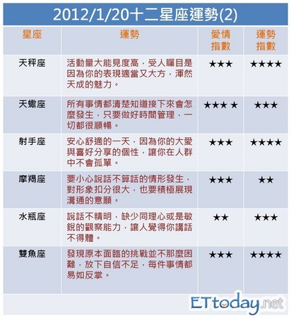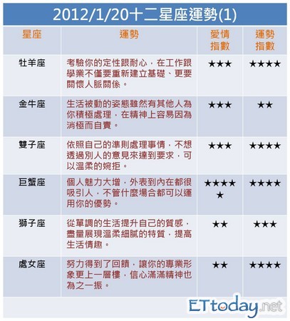 寶靈老師/ETtoday新聞雲每日星座運勢(2012.01.20) 寶靈老師/文 更多《ETtoday新聞雲》的精彩內容: 1.想看開運雲1/20十二星座詳細資訊,請點我 2.【寶靈老師】心測占卜--算出你2012靈數人際運勢 3.色彩占卜--你生命中的罩門在哪? 每日新聞精選 免費訂閱《ETtoday電子報》 01/24 全台詐欺最新數據 更多新聞 404 件 2 億 2802 萬 損失金額(元) 更多新聞 ※ 資料來源:內政部警政署165打詐儀錶板 ET快訊 快訊/歐陽榕病逝 相驗結果出爐 快訊/黃紹庭二審判決出爐 白軍購條例衝擊防衛作戰 國防部罕0730開記者會認「窒礙難行 快訊/惡保母姊妹虐死剴剴!高院駁回上訴 維持無期、18年刑期 帶老婆全裸鬧紅毯!肯爺崩潰道歉了 認腦部嚴重損傷 快訊/高點補教驚爆侵權!講師遭起訴 快訊/台股創新高! 記憶體2檔出關不同調 頂大男酒後遭丟包台64…4車輾過「爆頭慘死」!檢今將解剖追死 分享給朋友: 追蹤我們: ※本文版權所有,非經授權,不得轉載。[ ETtoday著作權聲明 ]※