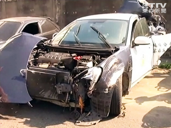 警車的車屁股整個被嚴重擠壓,一輛車變成了半輛車,車頭撞到安全島也半毀,車內安全氣囊爆裂,上面留下大量血跡,兩名巡邏員警反應不及遭撞,造成嚴重挫傷和骨折。