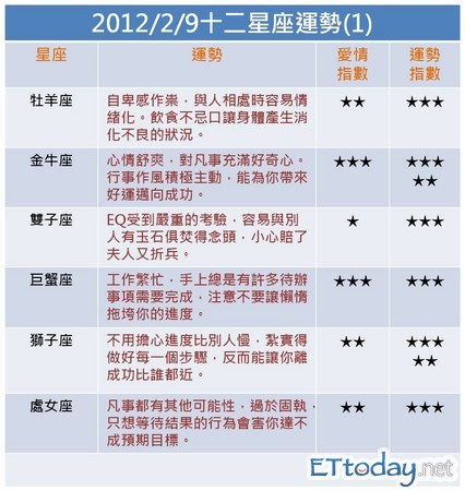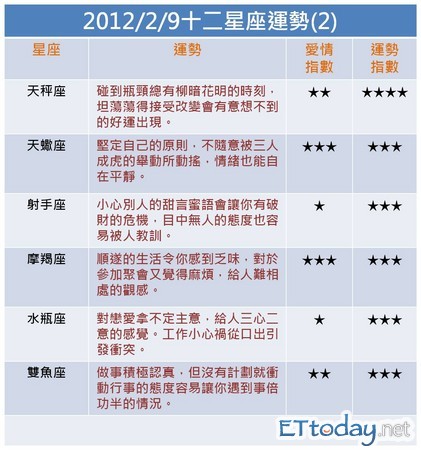 寶靈老師/ETtoday新聞雲每日星座運勢(2012.2.9) 我們想讓你知道…金牛座、獅子座運勢五顆星, 寶靈老師/文 更多《ETtoday新聞雲》的精彩內容: 1.想看開運雲2/09十二星座詳細資訊,請點我 2.【寶靈老師】心測占卜--算出你2012靈數人際運勢 每日新聞精選 免費訂閱《ETtoday電子報》 12/30 全台詐欺最新數據 更多新聞 566 件 2 億 1663 萬 損失金額(元) 更多新聞 ※ 資料來源:內政部警政署165打詐儀錶板 ET快訊 快訊/高雄今晨死亡火警! 鐵皮屋燃燒1死1昏迷 《功夫》袁祥仁元旦離世! 賣周星馳「如來神掌」成就20年迷因 快訊/瑞士酒吧跨年趴爆炸40死逾百傷 遺體嚴重損傷 分享給朋友: 追蹤我們: ※本文版權所有,非經授權,不得轉載。[ ETtoday著作權聲明 ]※