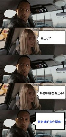 5格漫畫中這位平頭司機睜大眼睛瞪乘客,神情看起來頗不悅,而後座的女乘客對司機的舉動更是不滿,車內氣氛超緊張,隨時都可能爆發衝突,不過,這名面目兇狠的司機竟然只是在倒車!這張無厘頭的照片讓網友笑到飆淚。