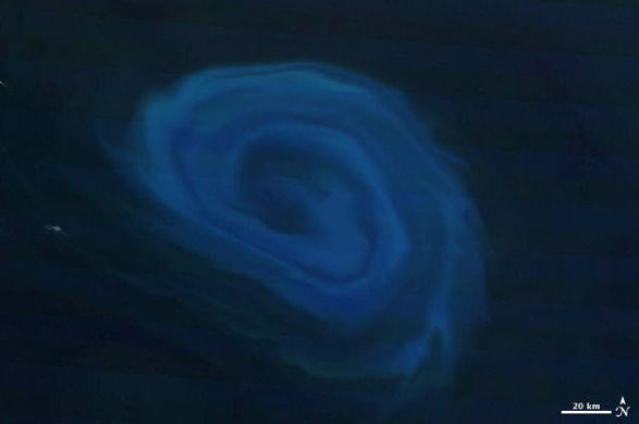 太空總署NASA的衛星去年12月底,拍到南非海岸出現一個相當奇特,直徑150公里的巨型海上漩渦,規模與大小和熱帶氣旋差不多,但因為漩渦把海底的浮游生物,大量帶到海面所以顏色呈現深藍色。