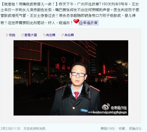 這時候先是有位火車女服務員王曉霞表示,自己願意用嘴巴幫女童把痰吸出來;但在她說完話後,李超的速度更快,馬上彎下身把自己的嘴巴對上女童的嘴,在他吸到第四下時,女童就發出了哭聲,而此時車廂裡也響起熱烈的掌聲。