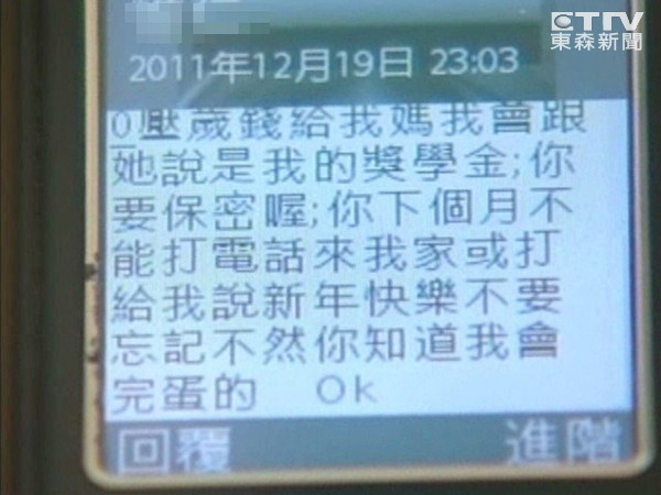 簡訊寫到「謝謝你的壓歲錢,我會拿三千給媽媽說是我的獎學金,你要保密喔!下個月不能打電話來我家或祝我新年快樂,不要忘記,不然你知道我會完蛋的。OK」指控李姓女子利用同學對她的好感不斷借錢。