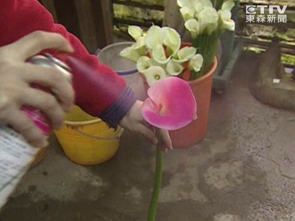 站在彩色海芋花束前,民眾看了又看,心中浮起疑問「這些海芋是真的還是假的?」原來這一朵朵紅色、紫色、黃色彩色海芋,全是靠這罐鮮花專用「噴漆」噴來的,原先的白色海芋1秒鐘變紅色海芋,一朵比白色貴5塊,在陽明山幾乎攤攤都有。