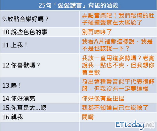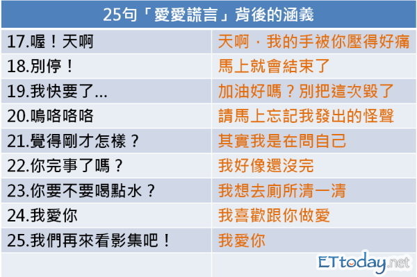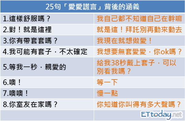 在床上的25句「愛愛謊言」 背後的真實含意是… 我們想讓你知道…大概說中了…一半吧。 國際中心/綜合報導 與伴侶「滾床單」時可能會說一些貼心、動聽的話,不過它們通常是言不由衷的!國外有網站搞笑整理出25句「愛愛謊言」,剖析情人們在床上甜言蜜語時,心裡都在想些甚麼! 每日新聞精選 免費訂閱《ETtoday電子報》 01/26 全台詐欺最新數據 更多新聞 524 件 2 億 9372 萬 損失金額(元) 更多新聞 ※ 資料來源:內政部警政署165打詐儀錶板 ET快訊 快訊/百病毒列法定傳染病 8檔防疫股刷漲停 快訊/聯結車載怪手「整台掉下來」 男騎士遭砸慘死 直播霍諾德攀101! Netflix遭痛批「缺責任感」急回應 快訊/國台辦宣布國共智庫論壇 將觸及「兩岸旅遊」議題 東區街頭施暴! 小黃運將遭拖下車痛扁 台灣101還是台北101? 最大推手發聲:都沒說錯啦! 關稅突飆25%! 川普鬆口「會跟南韓解決」 分享給朋友: 追蹤我們: ※本文版權所有,非經授權,不得轉載。[ ETtoday著作權聲明 ]※